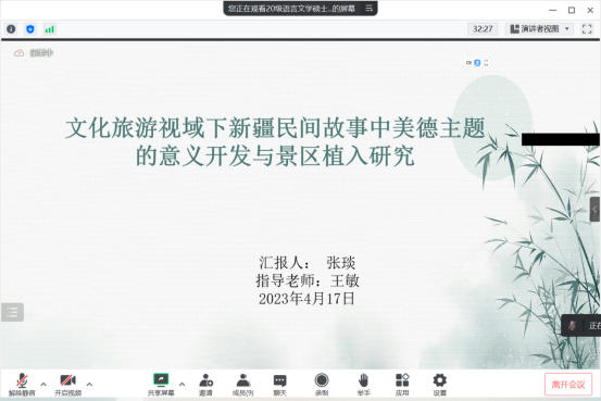 其次,20级硕士研究生张琰汇报了其以《文化旅游视域下新疆民间故事中美德主题的意义开发与景区植入研究》为题的项目成果答辩,并从课题研究内容、创新意义、预期完成目标、项目完成情况四个方面进行了汇报。随后,专家老师对该项目进行了评价。成湘丽老师认为该项目采用跨学科领域的研究方法具有一定的创新性,且在核心刊物《四川戏剧》发表了一篇论文,达到了预期的项目目标,但项目研究报告的重心偏离了该项目的主体,后期需注意将项目主题中的几个核心要素紧密结合。朱贺琴老师提出民间故事中美德主题的深层意义如何在该项目中进行体现需要进一步思考。庞海音老师则建议在该项目的研究报告中要有民间美德故事的具体呈现。