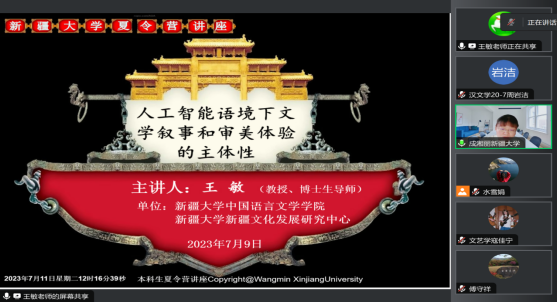新疆文化发展研究中心主任、中国语言文学学院教授王敏老师为各位营员带来精彩的专题讲座,提问环节各位营员围绕讲座相关内容积极踊跃地提问,教授们热情耐心而又切中肯綮地进行了积极回应。