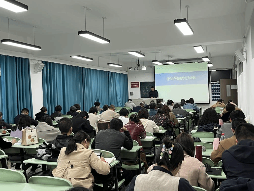 全面落实研究生导师立德树人职责的实施细则(试行)》;其次,就《研究生导师指导行为准则》出台背景向在座的各位老师解读并带领老师们学习《准则》的相关内容,结合学院实际情况及自身指导研究生经历从坚持正确思想引领、科学公正参与招生、精心尽力投入指导、正确履行指导职责、严格遵守学术规范、把关学位论文质量、严格经费使用管理、构建和谐师生关系八方面全方位对《准则》进行学习;最后,对研究生导师指导行为“十不得”进行宣讲。并要求全体研究生导师在今后研究生指导工作中,严格遵守《准则》内容,以身作则,坚持守好研究生导师是研究生培养的第一责任人的原则,培养优秀的高质量的复合型硕博士研究生。